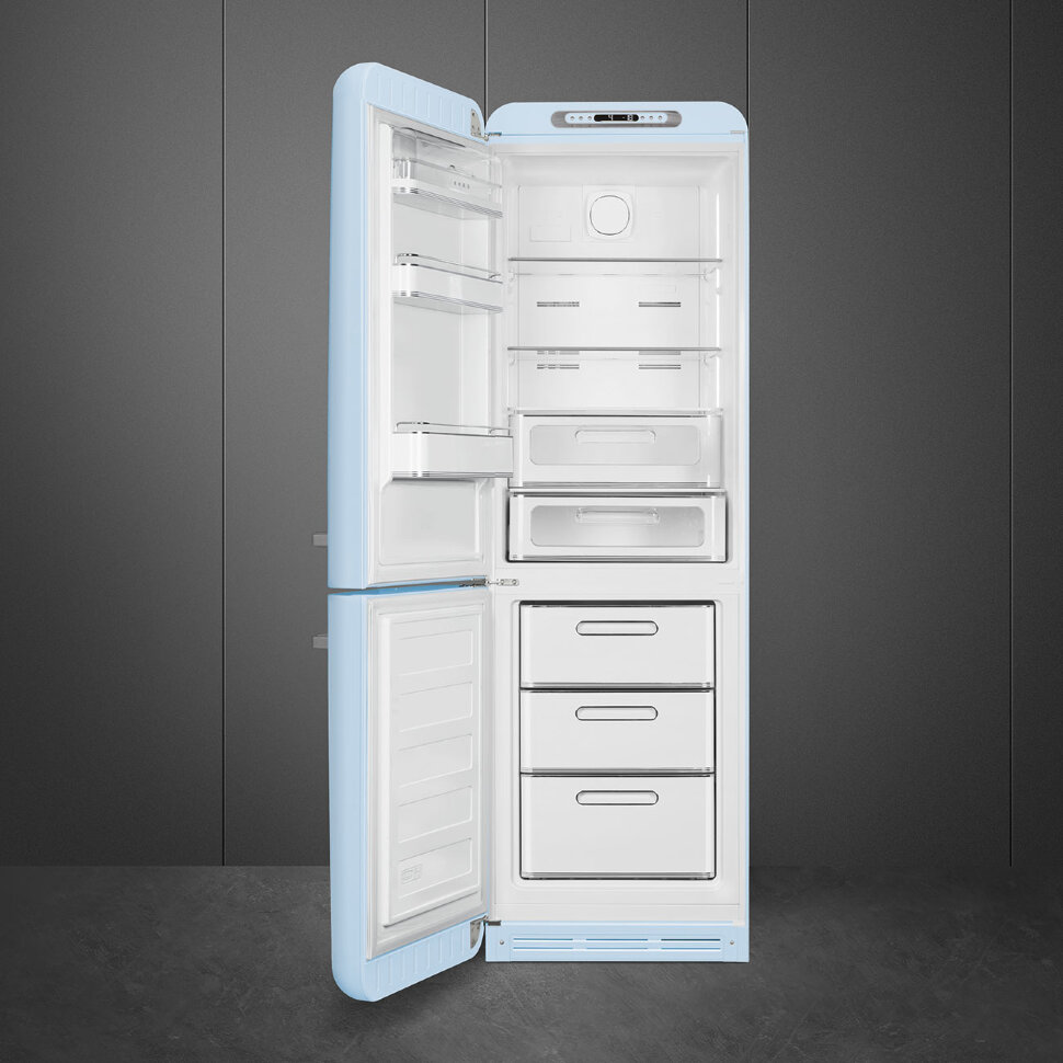 Холодильник SMEG FAB32LPB5 предназначен для кратковременного хранения различных готовых блюд, охлаждённых продуктов и напитков, а также для заморозки и длительного хранения замороженных продуктов и полуфабрикатов. Полки изготовлены из закалённого стекла, благодаря чему выдерживают большую нагрузку. Полки на дверцах выполнены из пластика. Данная модель идеально подойдёт для авторских интерьеров в уникальном стиле или для кухонь в классическом исполнении.