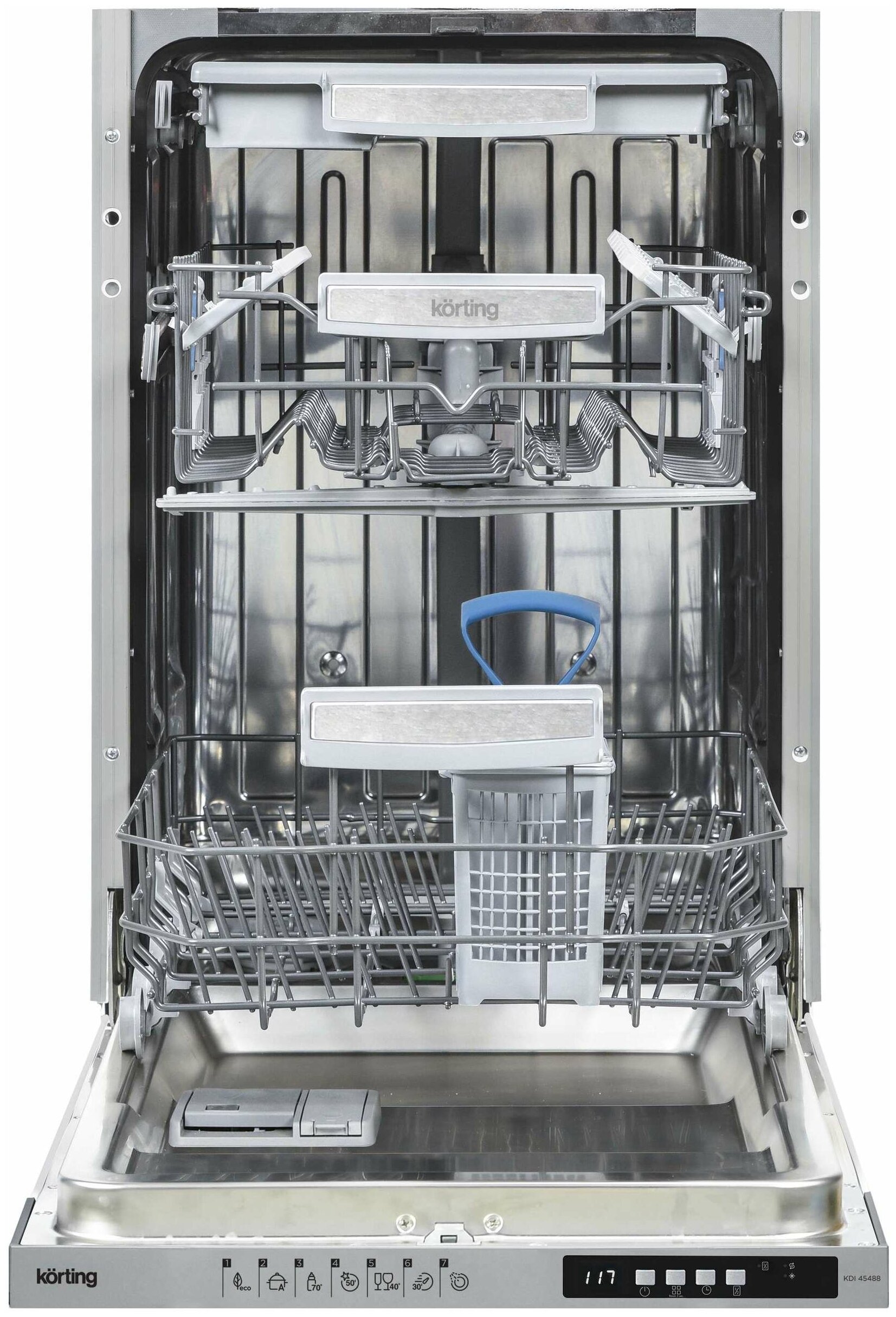Встраиваемая посудомоечная машина Korting KDI 45488 оснащена полной защитой от протечек, что гарантирует безопасную эксплуатацию. Специальный индикатор «луч на полу» проецирует время до окончания программы. Автопрограмма определяет степень загрязнения посуды и подбирает нужную температуру для мытья. Мобильный лоток для столовых приборов помещается в нижнюю корзину.