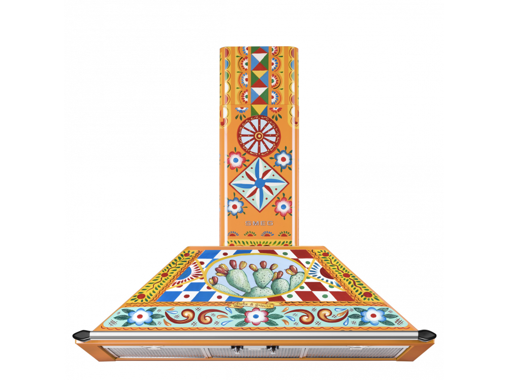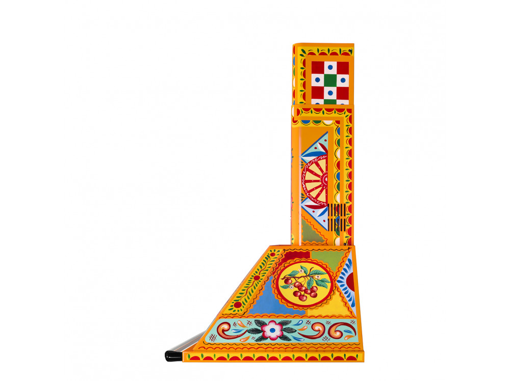 Взрыв ярких красок, полный повествовательного акцента: украшение этого кухонного прибора черпает вдохновение из мотивов традиционной сицилийской тележки, используемой странствующими торговцами цитрусовыми фруктами и десертами изо льда, которую можно найти в самых живописных уголках Сицилии. Формы и цвета воспевают поэтику этого образа, одного из самых узнаваемых фольклорных символов острова. Фронтальная часть украшена геометрическими, полихромными и ромбовидными мотивами, используемыми и в напольной плитке и стилизованными звездочками и цветами, которые отсылают к нежной весенней атмосфере. В центре корпуса вытяжки доминирует характерная для Сицилии опунция, по бокам изображены фрукты, внизу – фриз из растительных и цветочных мотивов. Декоративный орнамент продолжается до самого дымохода, гармонично завершая эту симфонию узоров и роскошных оттенков.